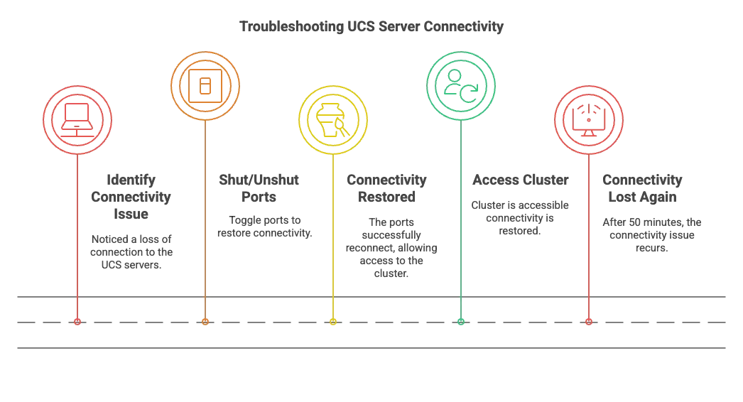 I shut/unshut the ports for the UCS servers, and miraculously the ports went back to connected, and I was able to access the cluster again. Success! For approx 50 minutes... Then, lost connectivity again...